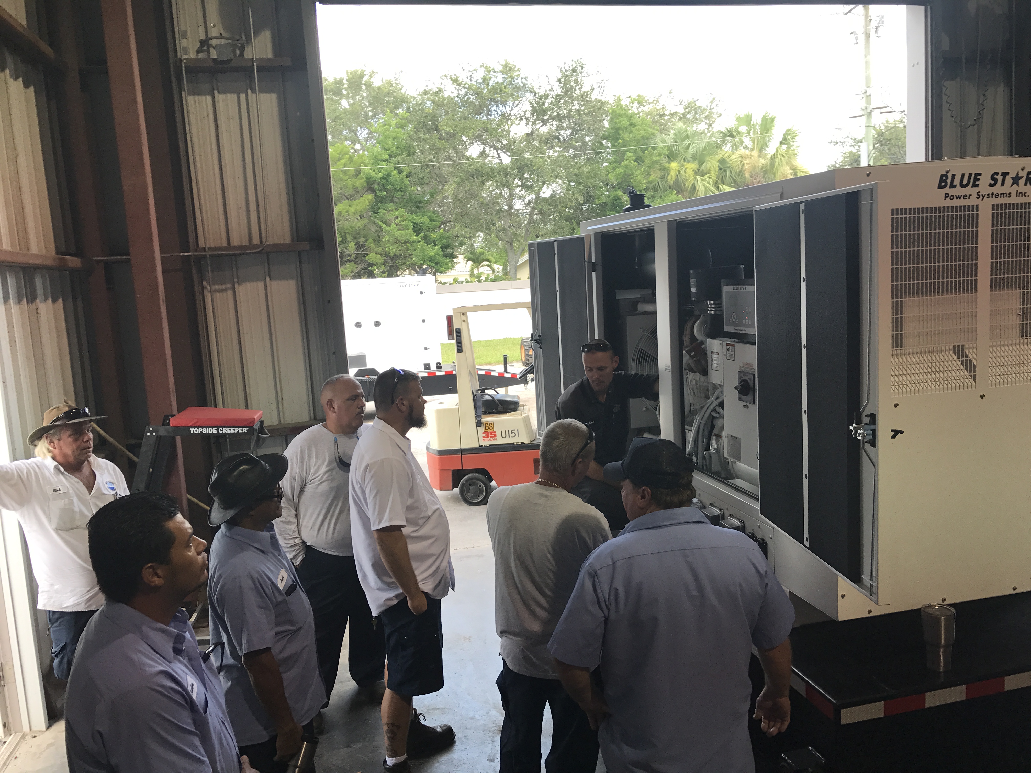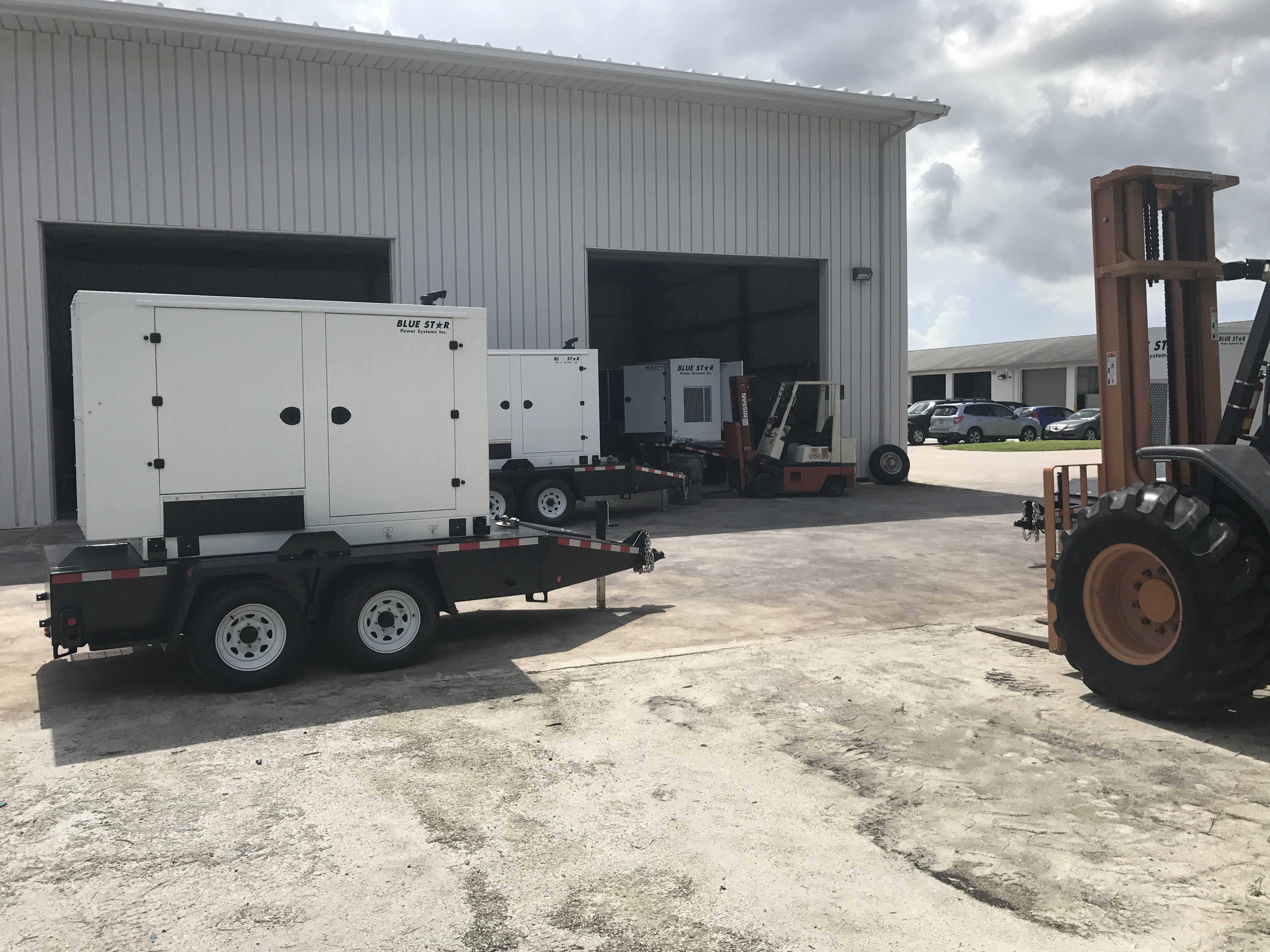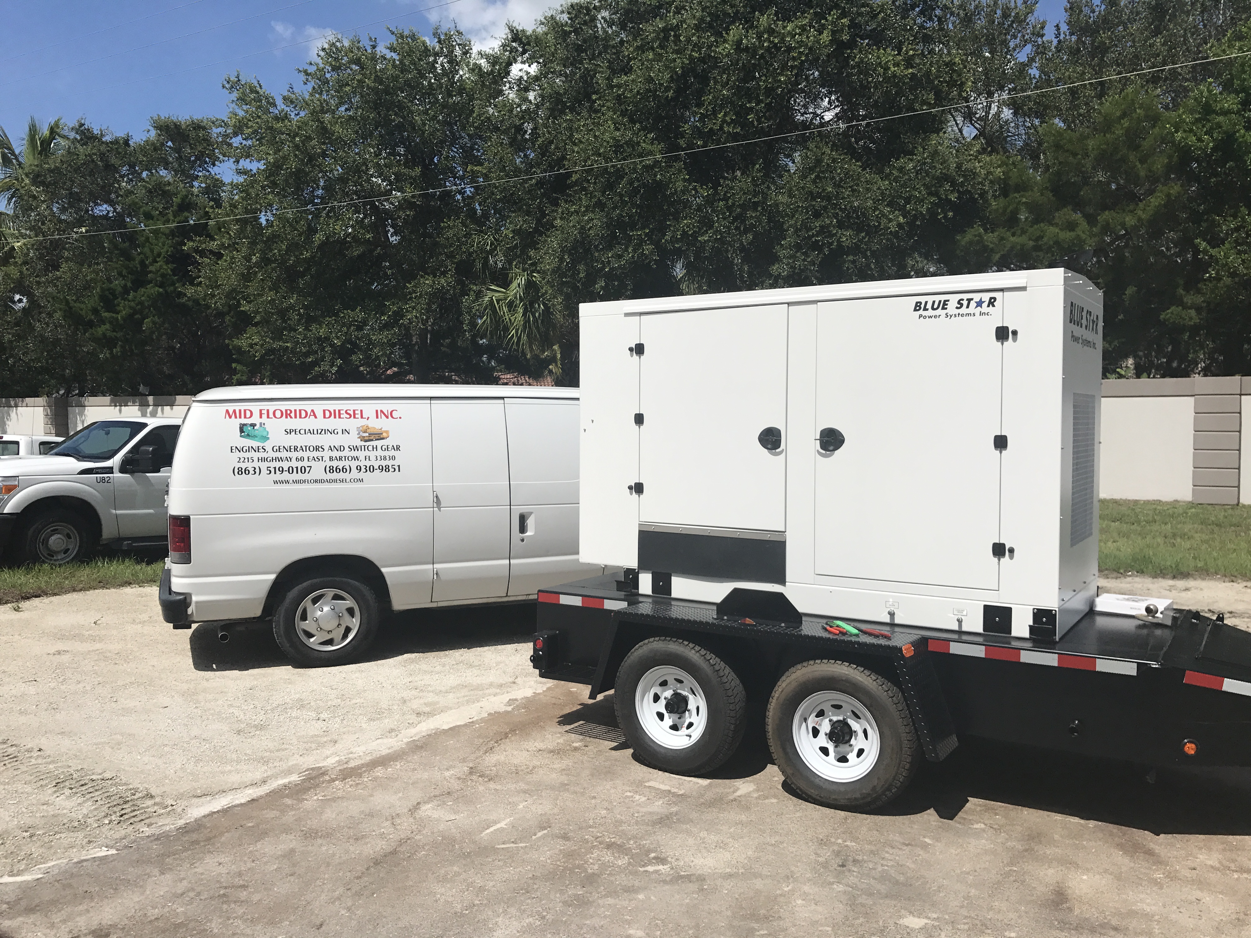 Mid Florida Diesel delivered 4 Blue Star 100 KW Trailer Mounted generators to Seacoast Utility Authority (SUA). MFD performed the factory start-up and training for the SUA personnel. All generators were built with John Deere engines, Basler Controls and Marathon Alternators. They were fitted with 4 position voltage selector switches, Permanent Magnets, and Camloc connections for the power cables.